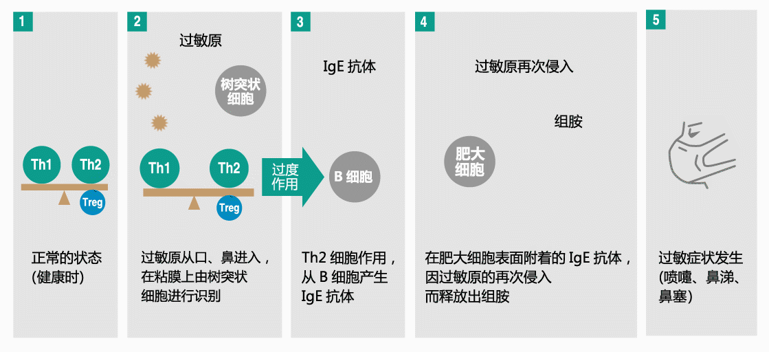 过敏是免疫功能针对侵入人体的本来无害的物质过度作用的结果。在异物(过敏原)通过口、鼻进入体内后,在粘膜上被树突状细胞识别。免疫平衡无法保持,Th2细胞处于优势状态后,Th2细胞为了排除过敏原而过度作用, B细胞被激活,过度产生IgE抗体。于是,IgE抗体与肥大细胞的表面结合,防备过敏原的再次侵入。然后,在过敏原再度侵入人体后,肥大细胞表面的IgE抗体识别过敏原,从肥大细胞中过度释放出组胺、白三烯等的炎症因子,引起喷嚏、鼻涕、鼻塞等的过敏症状。